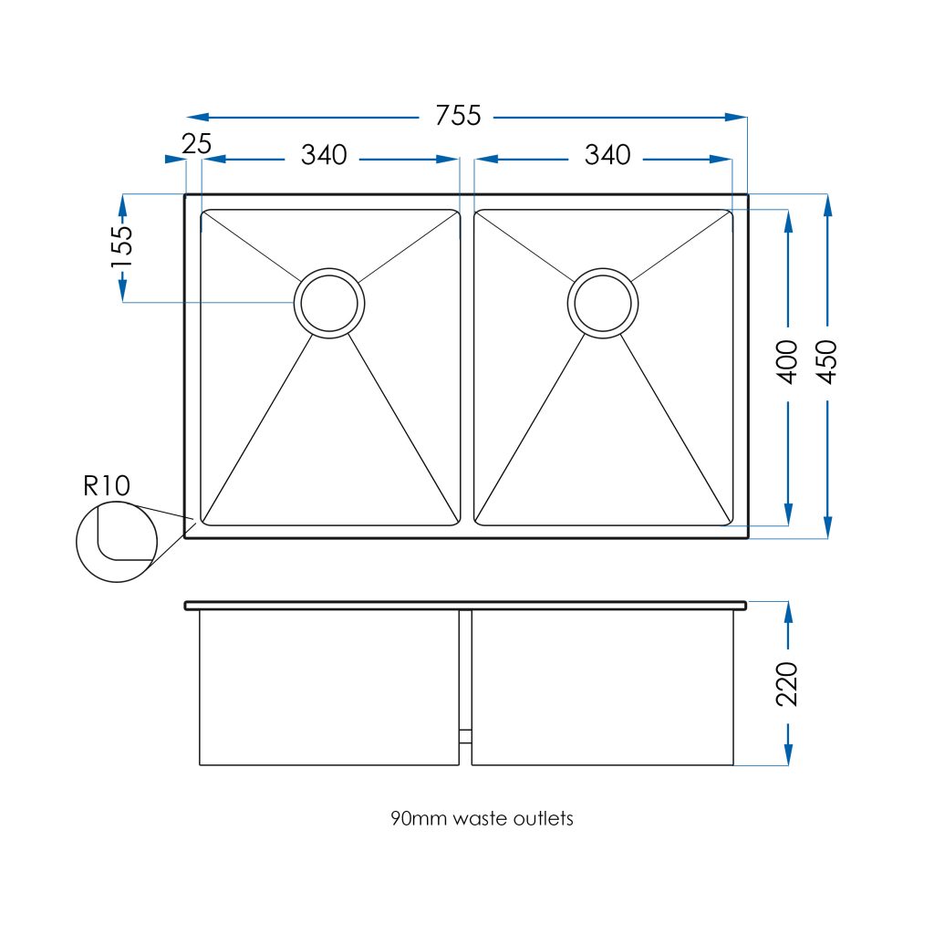 For a sink with as much to give as the Burazzo, considerable thought has gone into the design. The Burazzo design is square with a tight and clean 10mm corner radius, plus a slightly deeper bowl of 220mm makes for a practical design with absolutely no compromise on elegance. The sink wastes are located at the back giving the customer a superior look and more room in underneath cupboard space.