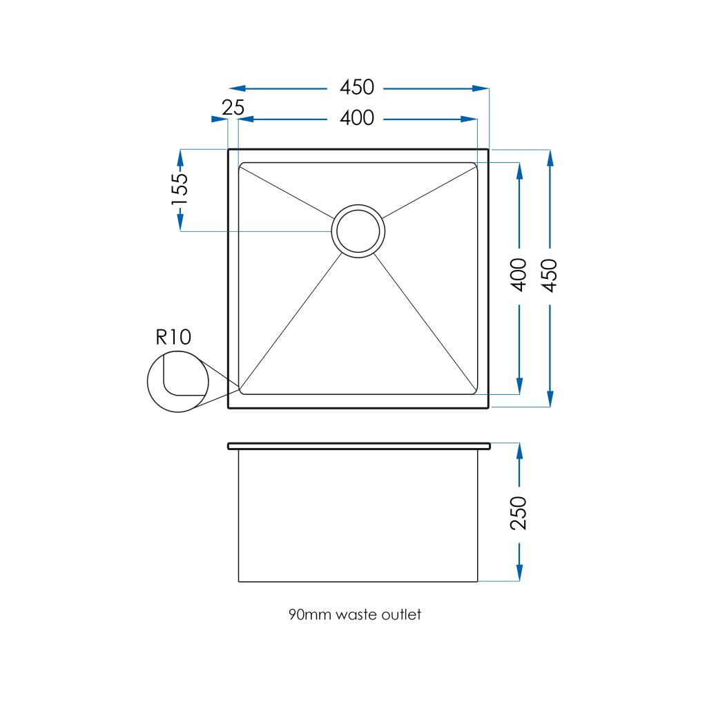 For a sink with as much to give as the Burazzo, considerable thought has gone into the design. The Burazzo design is square with a tight and clean 10mm corner radius, plus a slightly deeper bowl of 250mm makes for a practical design with absolutely no compromise on elegance. The sink wastes are located at the back on all single bowl models giving the customer a superior look and more room in underneath cupboard space.